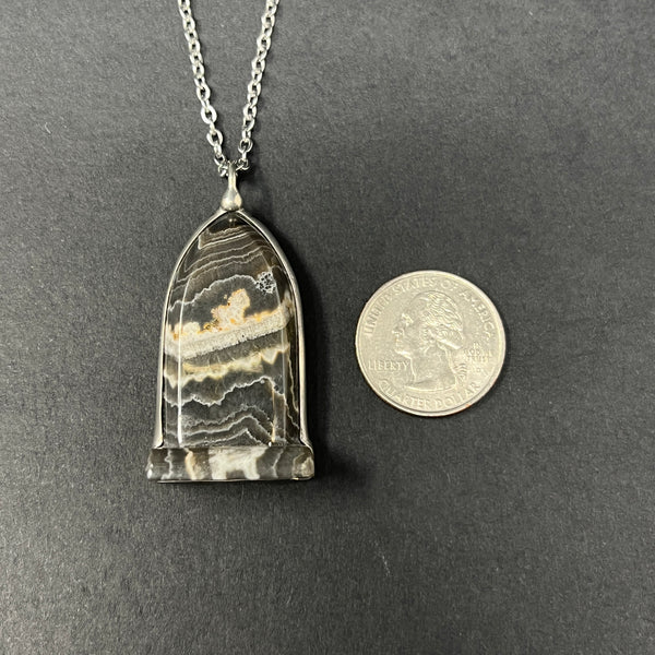 This piece is hand polished, suspended from an 18 inch Stainless Steel chain.