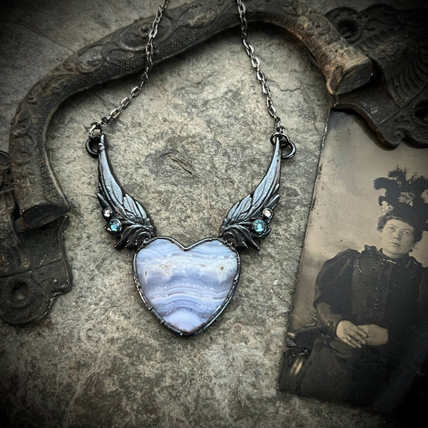A Blue Lace Agate heart cabochon was created into a pendant using a process called electroform; depositing pure copper plating onto items using chemicals and electricity.