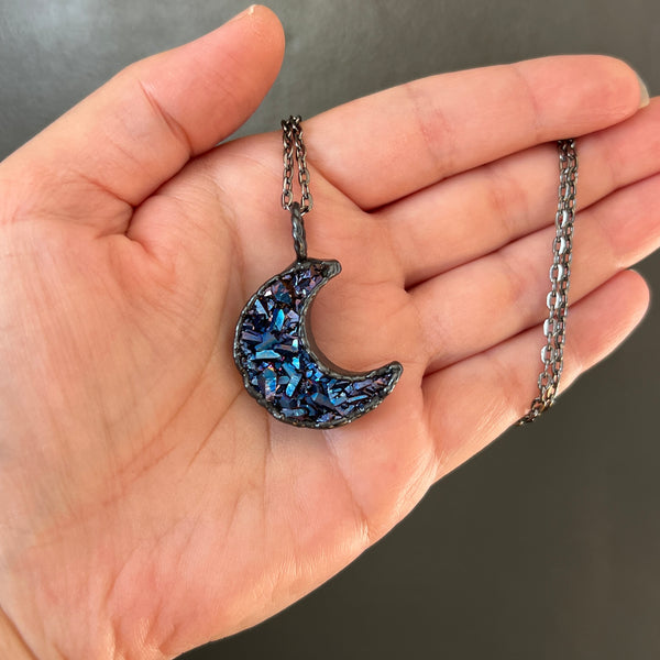 A Titanium coated Agate moon was created into a pendant using a process called electroform; depositing pure copper plating onto items using chemicals and electricity.