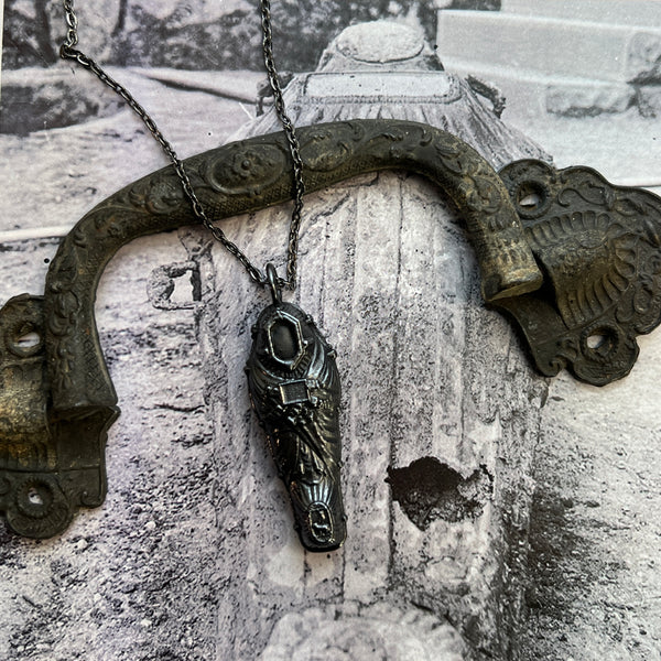A mini replica of a life size Fisk coffin was created into a pendant using a process called electroform; depositing pure copper plating onto items using chemicals and electricity.
