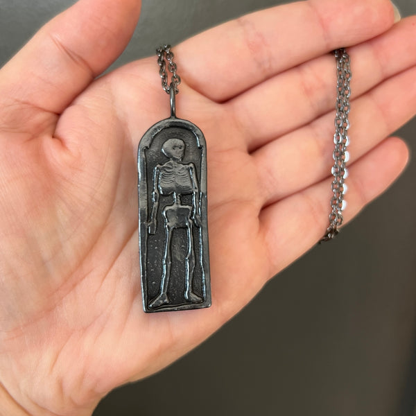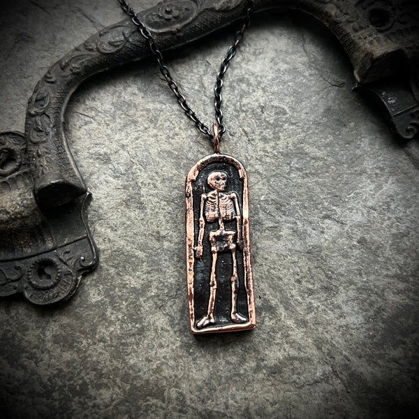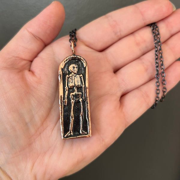 “Death Comes to Salem” was 3D scanned using photogrammetry to be scaled down in size, resin printed, and then created into a pendant using a process called electroform; depositing pure copper plating onto items using chemicals and electricity.