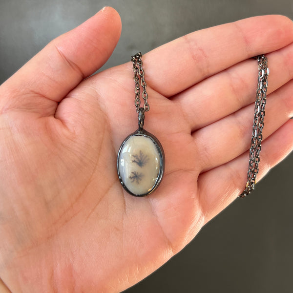 A small Dendritic Agate cabochon was created into a pendant using a process called electroform; depositing pure copper plating onto items using chemicals and electricity.