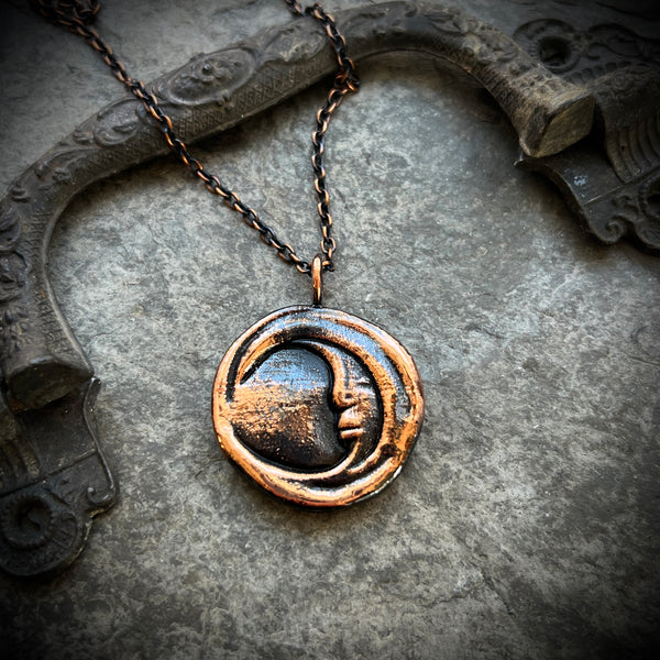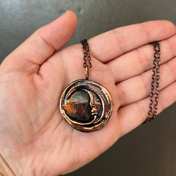 This piece is hand polished, and lacquered to slow down the tarnishing process, and suspended from an 18 inch copper or gunmetal chain.