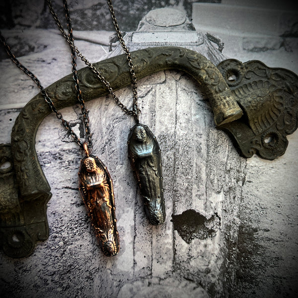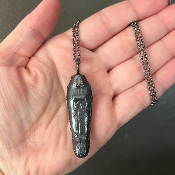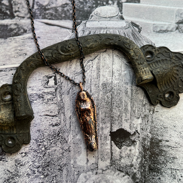 A mini replica of a Fisk coffin was created into a pendant using a process called electroform; depositing pure copper plating onto items using chemicals and electricity.