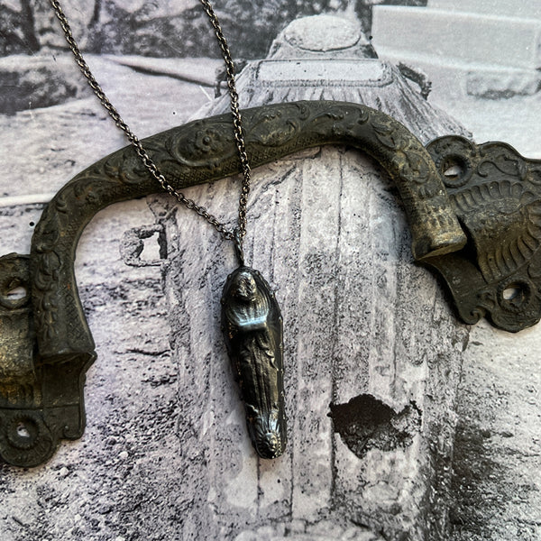 This piece is hand polished, a darkening patina has been added to bring out the details, lacquered, and suspended from an 18 inch chain.