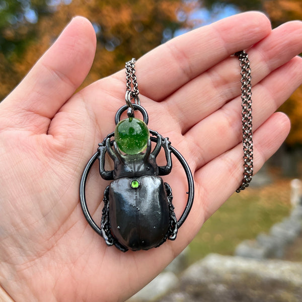 The Uranium Glass marble that it’s holding is 1920’s super glower. The cicada was 3D scanned from a real cicada and then resized slightly for the necklace.