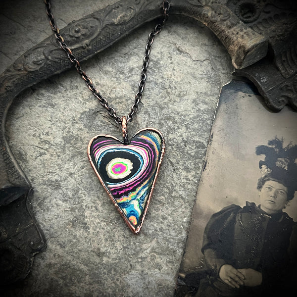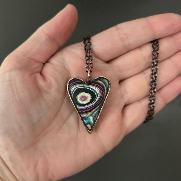 A Funkite cabochon was created into a pendant using a process called electroform; depositing pure copper plating onto items using chemicals and electricity.