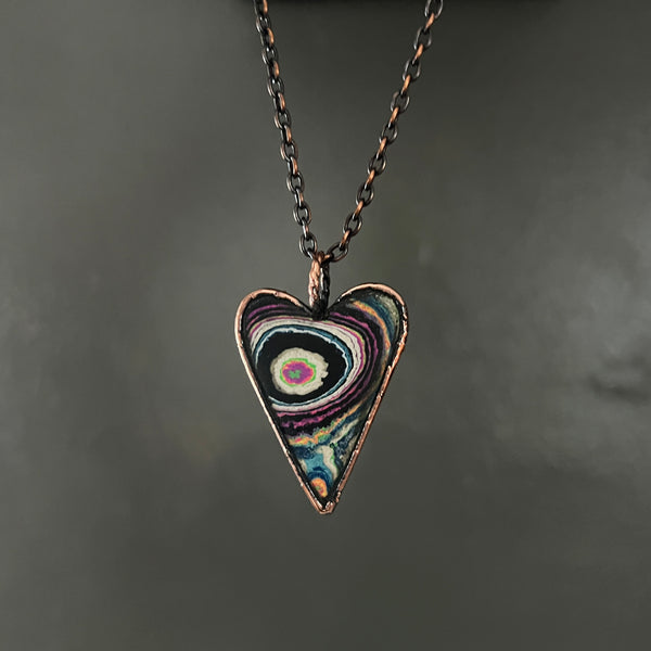 This piece is hand polished, lacquered, and suspended from an 18 inch copper chain.