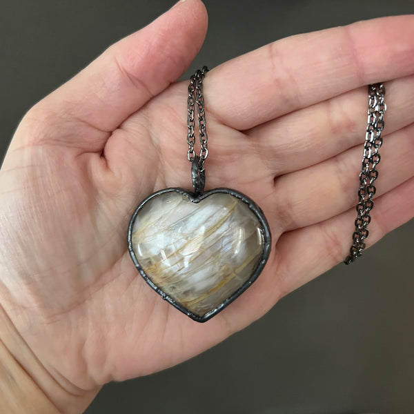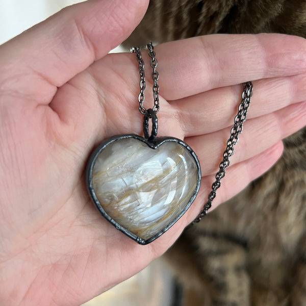 A large Peach Moonstone heart was created into a pendant using a process called electroform; depositing pure copper plating onto items using chemicals and electricity.