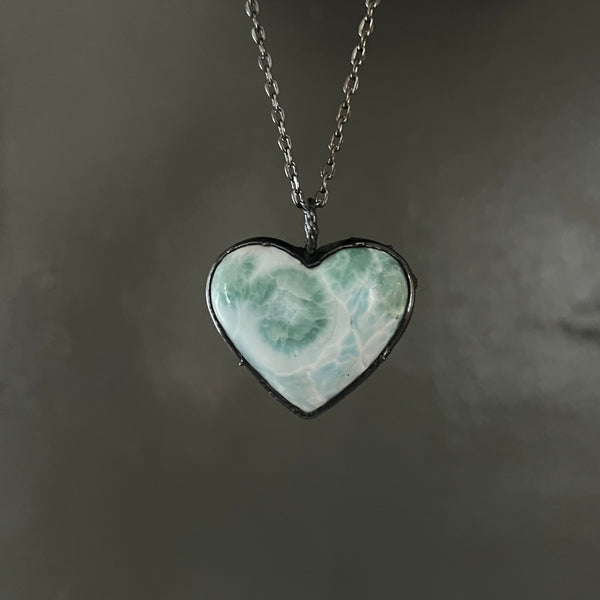 A Larimar heart shaped cabochon was created into a pendant using a process called electroform; depositing pure copper plating onto items using chemicals and electricity.