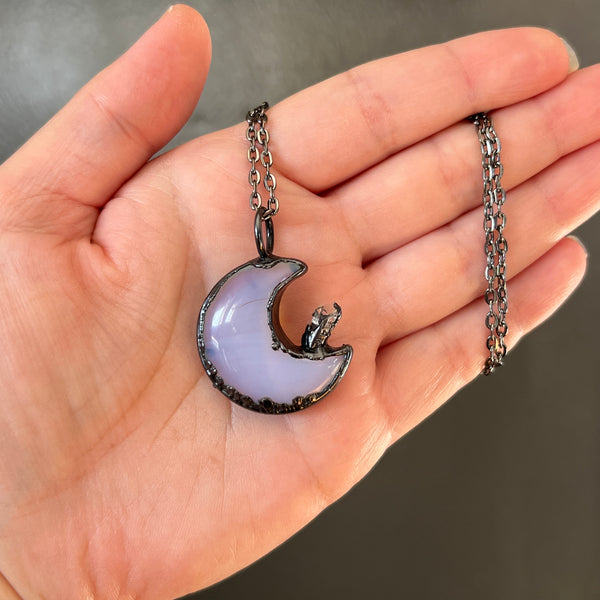 An Opalite moon and tiny Quartz point was created into a pendant using a process called electroform; depositing pure copper plating onto items using chemicals and electricity.