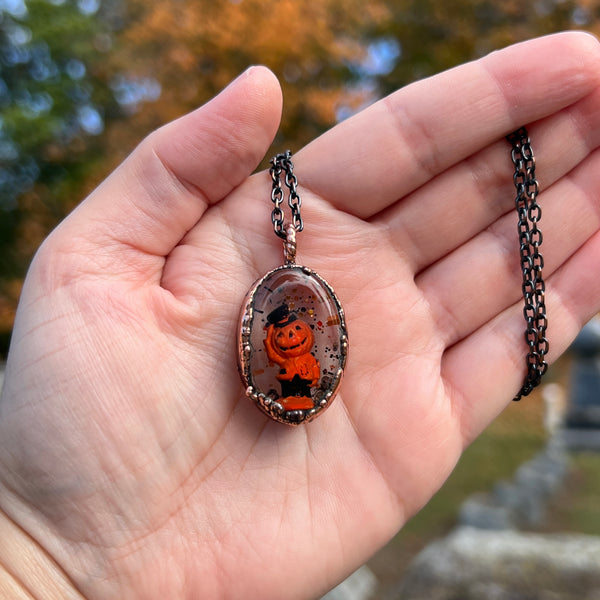 A cabochon with a hand painted mini Vintage Halloween blow mold and glitter were encased in resin to create a pendant using a process called electroform; depositing pure copper plating onto items using chemicals and electricity.
