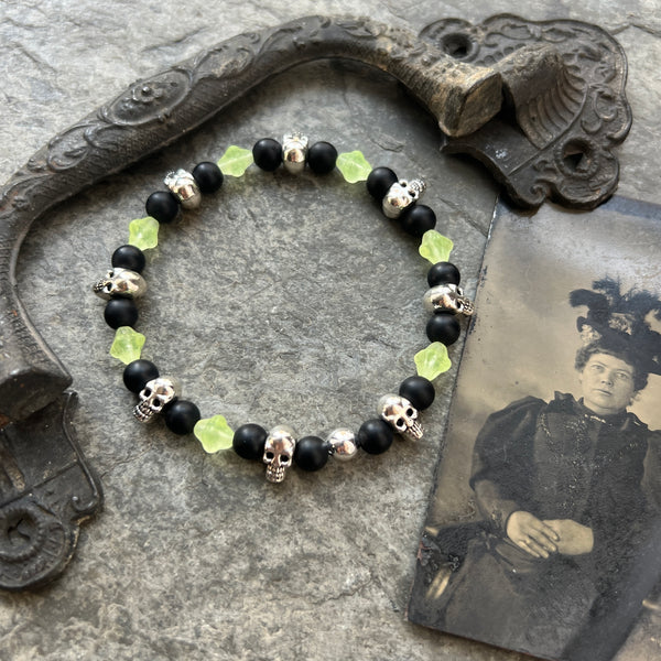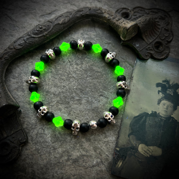These bracelets are strung on thick elastic cord using 6mm Black Onyx, and Uranium glass beads with silver plated accent beads. Each bracelet measures approximately 7 1/2 to 7 3/4 inches before tied. They will fit most wrists. Uranium glass glows in long wave UV light.