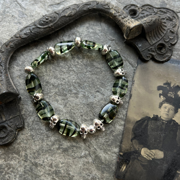 These bracelets are strung on thick elastic cord using Uranium glass beads with silver plated accent beads. Each bracelet measures approximately 7 1/2 to 7 3/4 inches before tied. They will fit most wrists. Uranium glass glows in long wave UV light.