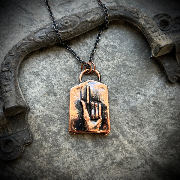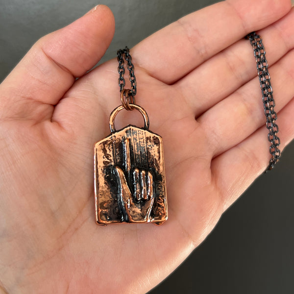 This piece is hand polished, and lacquered to slow down the tarnishing process, and suspended from an 18 inch copper or gunmetal chain.